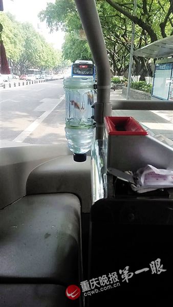 重慶晚報(bào)記者從前門(mén)上車(chē),一眼就看見(jiàn)門(mén)柱上綁一個(gè)小號(hào)飲料瓶,票箱旁綁著一個(gè)大號(hào)飲料瓶,瓶子被白色扎帶和膠皮管牢牢系住,瓶口向下,瓶子底部被剪開(kāi)朝上。大號(hào)瓶里有兩條小金魚(yú),正歡快地游著。