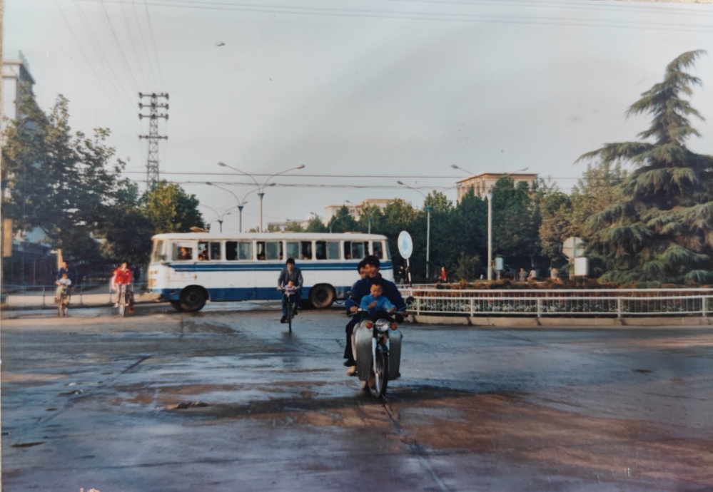 ▲90年代初,荊門市象山大道街景(?;坜D盤)。道路上車輛很少,公交車、摩托車、自行車是主流。