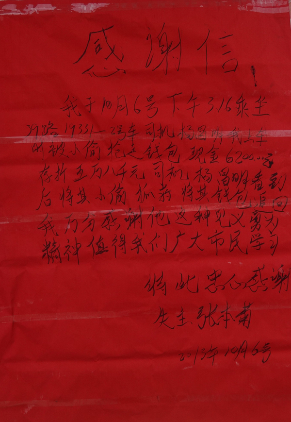 公交公司相關(guān)人員表示,對(duì)于楊昌明見義勇為的行為,肯定會(huì)給予獎(jiǎng)勵(lì)。記者還了解到,失主張女士于7日將一封感謝信交到了楊昌明所在的公交公司,再次表達(dá)了她的感激之情。