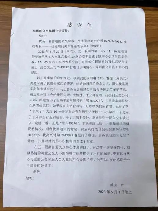 5月4日,小雨,一位熱心乘客走進了荊門市公共交通集團有限公司客服中心,送來一封溫暖的感謝信。信中,她向“五一”節(jié)假日期間堅守崗位、積極熱心的公交人表達了濃濃謝意,紙短情長,字里行間流露出款款真情。